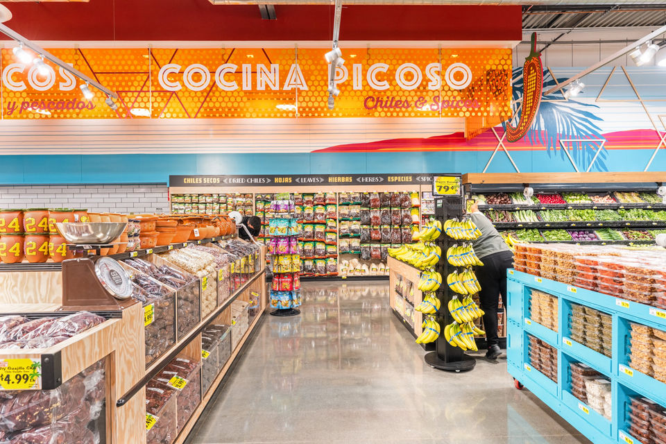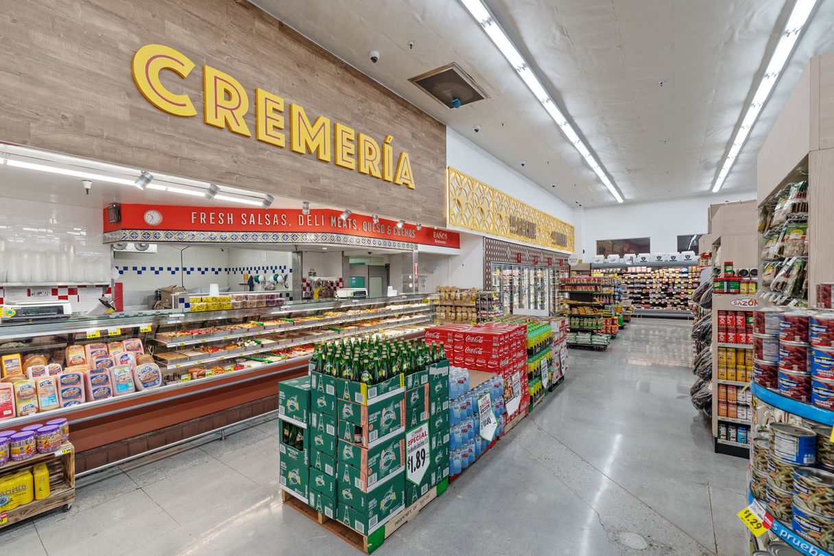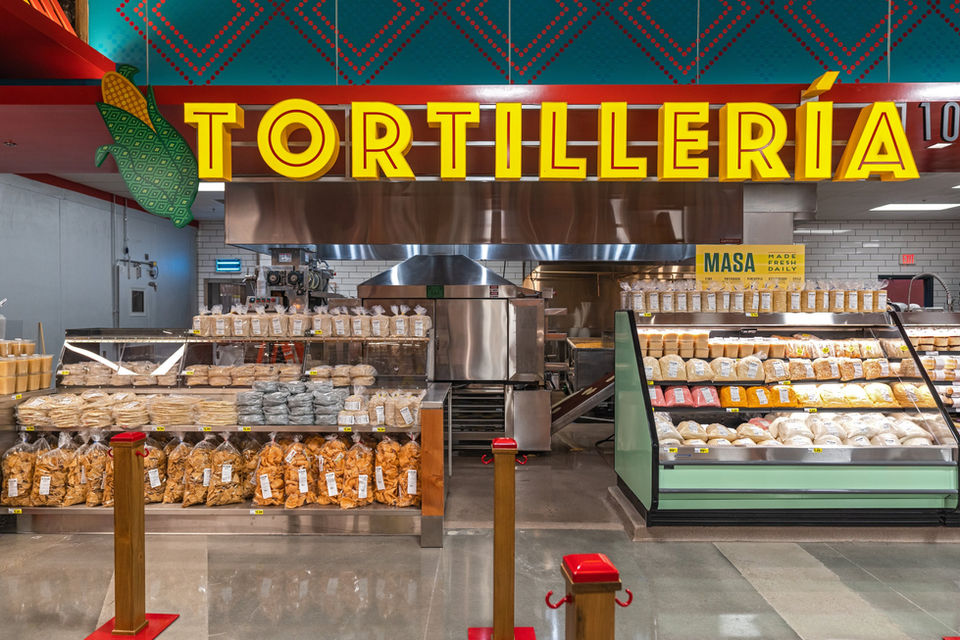It features an array of specialty sections that cater to a variety of needs: an in-house bakery, tortilleria, floral shop, meat department, and a food court called “La Cocina”.